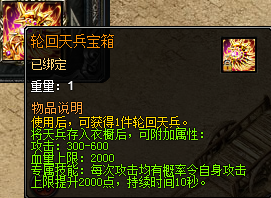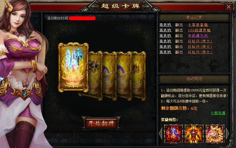 【活动内容】:活动期间,每提取10000元宝,即可获得一次翻牌机会,翻牌百分百中奖,每次翻牌从六张牌中抽取一张,更有几率获得噬血兽鬼面、钢铁奇侠时装礼盒、轮回天兵宝箱、高级符文卷抽、9级黑水晶礼盒、神皇装备箱!