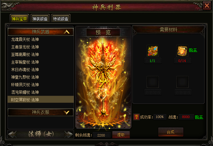 在神兵利器界面,通过使用战魂和神兵谱,可以将混沌荣耀套装升级为时空溟寂套装,属性更高,造型更华丽,是您提升战力的不二选择!
