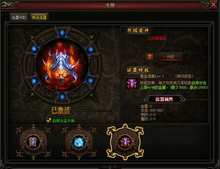 传说法器噬血兽鬼面等级上限提升至3级,让您战力更上一层楼。 在传说法器界面,只要达到对应的升级条件,即可提升法器等级,提升法器属性,提高法器技能效果。 温馨提示:技能兽血沸腾吸取的血量上下限因职业不同而不一样。