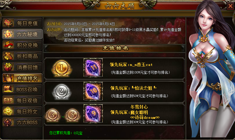 【活动说明】:活动期间,本服累计充值排名前5名便可获得丰厚奖励!排名第1更可获得11级黑水晶的奖励!累积充值300000元宝即可参与排名!活动结束后,奖励通过邮件发放!