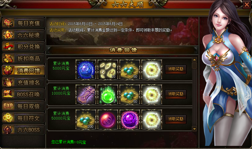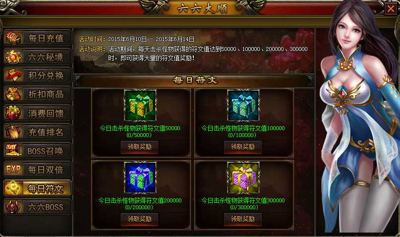 【活动说明】:活动期间,每天击杀怪物获得的符文值达到50000、100000、200000、300000时,即可获得大量的符文值奖励
