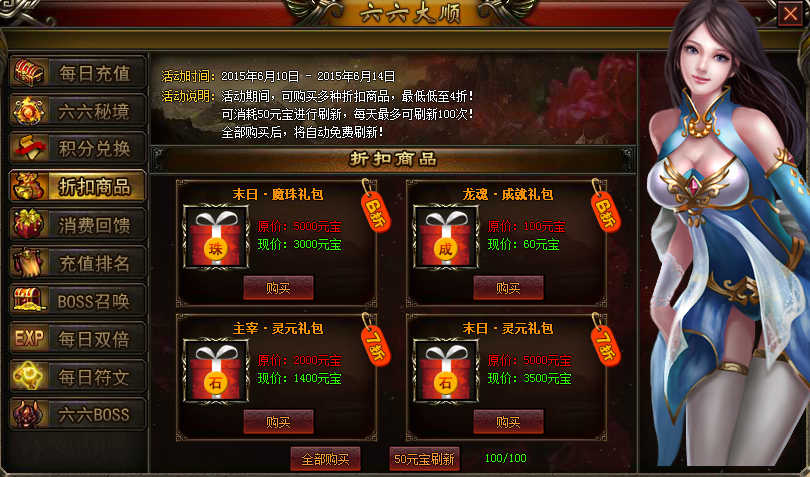【活动说明】:活动期间, 可购买多种折扣商品,最低低至4折!可消耗50元宝进行刷新,每天最多可刷新100次!全部购买后,将自动免费刷新