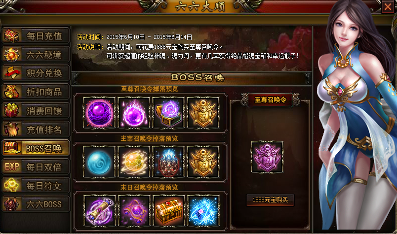 【活动说明】:活动期间,可花费1888元宝购买至尊召唤令。可斩获超值的经验神魂、魂力丹,更有几率获得绝品橙魂宝箱和幸运骰子!