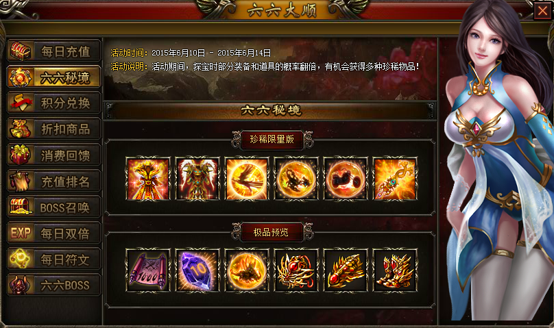 【活动说明】:活动期间,探宝时部分装备和道具的概率翻倍,有几率获得多种珍稀道具!