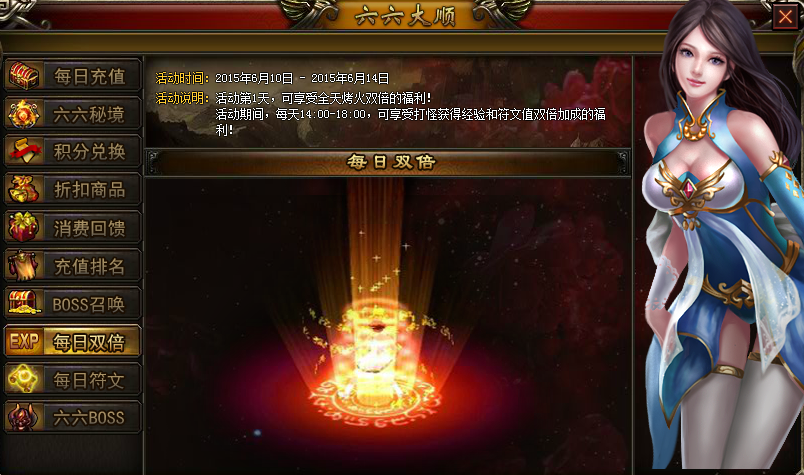 【活动内容】:活动第一天,全天双倍烤火!活动期间,每天14:00 – 18:00,可享受打怪获得经验和符文值双倍加成的福利!