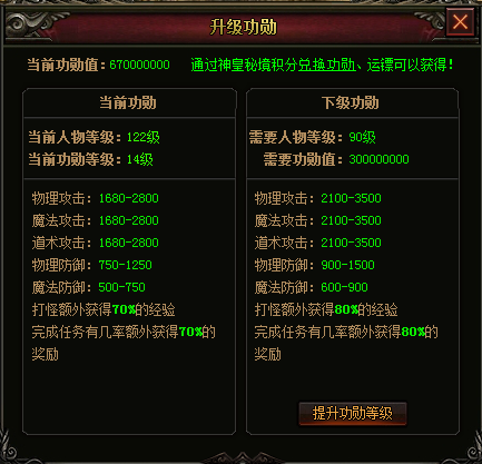 感觉打怪经验加成不够高?那就赶紧来试试14级和15级功勋,打怪额外获得70%和80%的经验,还附带完成任务有几率额外获得高额经验加成,最后还有超高属性加成。三者兼备,无可挑剔!