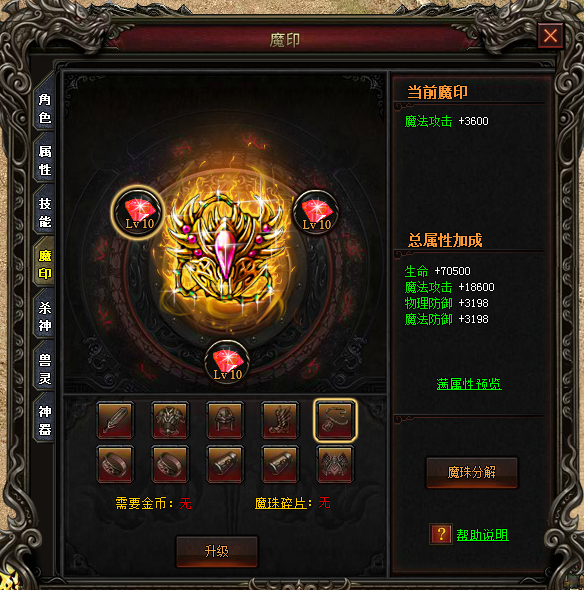 通过消耗魔珠碎片可以将魔印进行升级,魔珠碎片可通过击杀野外高级BOSS或者分解星芒魔珠获得。