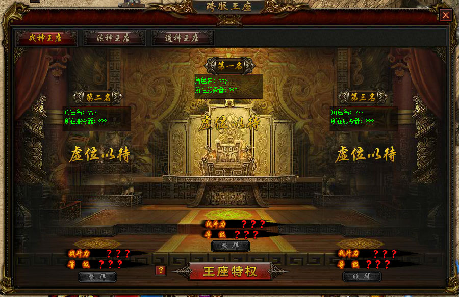 在跨服王座里,您可以和不同服务器的同职业玩家进行战力比拼,看谁才是真正的职业第一!!!各职业战力排名第一、二、三,可以直接上榜,成就王位,更同时获得王座特权。