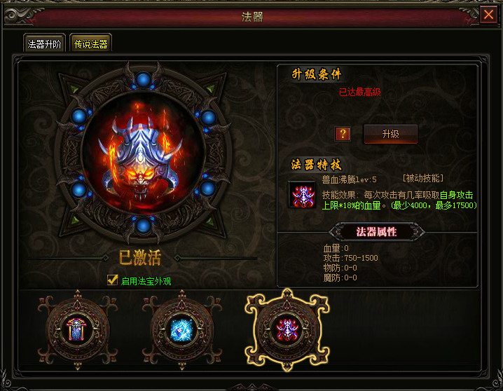 在传说法器界面,只要达到对应的升级条件,即可提升法器等级,提升法器属性,提高法器技能效果。