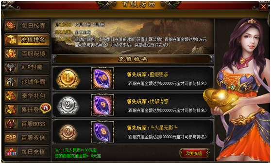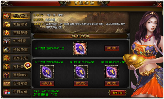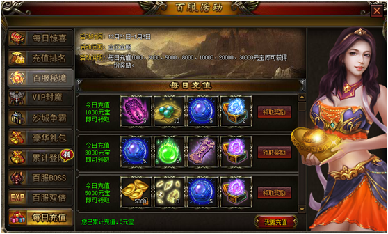【活动说明】:每日充值1000、3000、5000、8000、10000、20000、30000元宝即可获得一份奖励