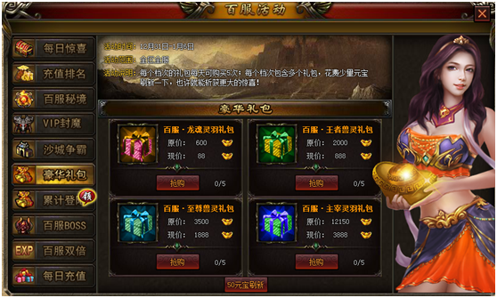 【活动说明】:每个档次的礼包每天可购买5次,每个档次包含多个礼包,花费少量元宝刷新一下,也许就能斩获更大的惊喜!