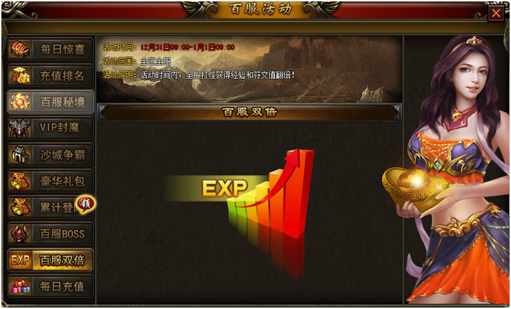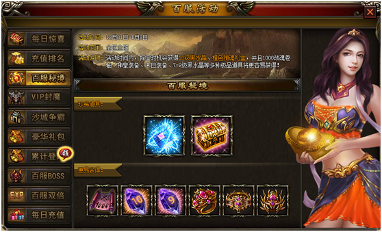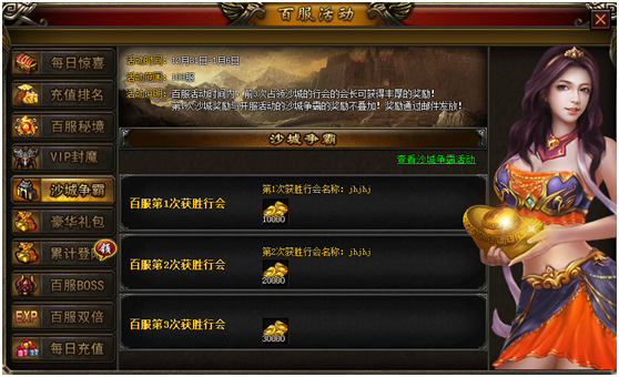 【活动说明】:百服活动时间内,前3次占领沙城的行会的会长可获得丰厚的奖励!