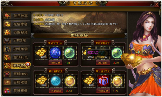 【活动说明】:活动期间,累积登陆天数达到1.3.5.7天即可领取丰厚的百服庆典大礼!