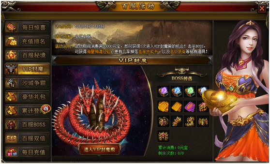 【活动说明】:活动期间消费满50000元宝,即可获得1次进入VIP封魔殿的机会!击杀BOSS,可获得海量神魂经验,更有几率掉落高等技能书,以及高级装备等稀有道具!