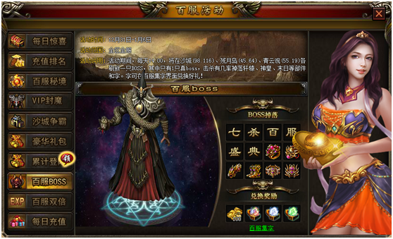 【活动说明】:活动期间,每天14:00。将在沙城(98,116)、残月岛(45,64)、青云观(55,19)各刷新一只BOSS,其中一只真BOSS,击杀有几率掉落轩辕、神皇、末日等部件和字。