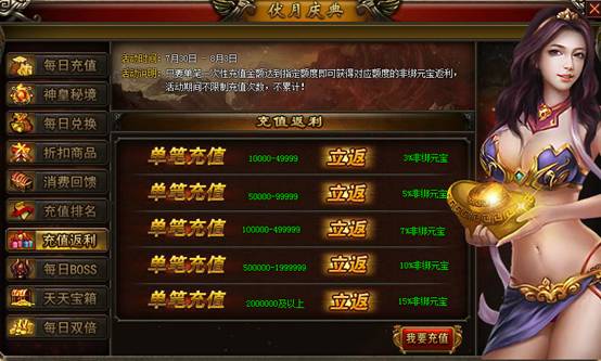 【活动说明】:只要单笔一次性充值金额达到指定额度即可获得对应额度的非绑元返利,活动期间不限制充值次数,不累积!