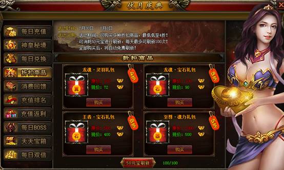 【活动说明】:活动期间,可购买多种折扣商品,全场最低低至4折!可消耗50元宝进行刷新,每天最多可刷新100次!全部购买后,将自动刷新!