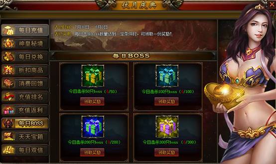 【活动说明】:每日击杀boss数量达到一定条件时,可领取一份奖励!