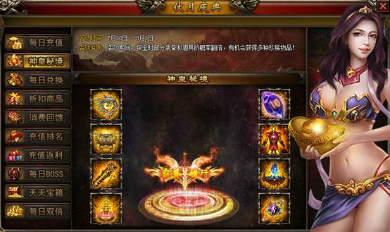 【活动说明】:活动期间,探宝时部分装备和道具的概率翻倍,有几率获得多种珍稀道具!