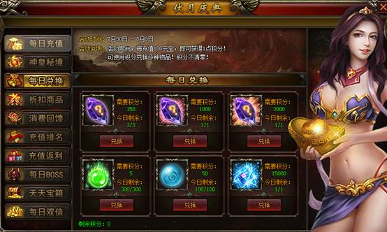 【活动说明】:活动期间,每充值100元宝,即可获得1点积分!可使用积分兑换多种物品!积分不清零!