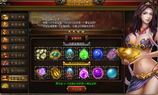【活动说明】:开启宝箱获得一个宝物!每整10次开启宝箱,则可百分百获得一个黄金宝物!开启宝箱需要1个宝箱钥匙,可通过日常副本获得!