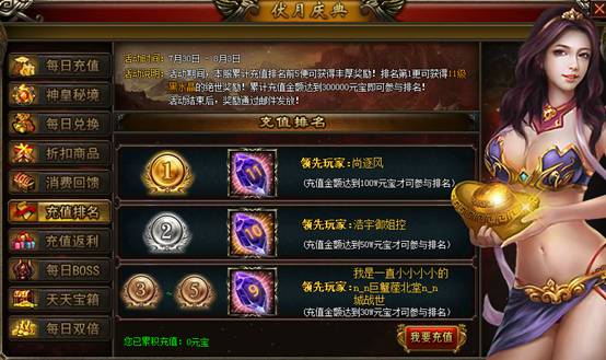 【活动说明】:活动期间,本服累计充值排名前5名便可获得丰厚奖励!排名第1更可获得11级黑水晶的奖励!累积充值300000元宝即可参与排名!活动结束后,奖励通过邮件发放!
