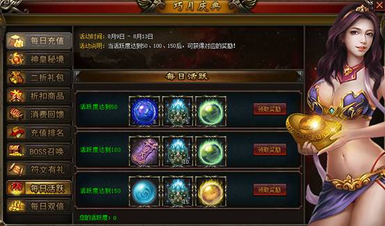 【活动说明】:当活跃度达到50、100、150后,可获得对应的奖励!