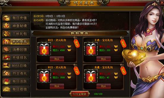 【活动说明】:活动期间,可购买多种折扣商品,全场最低低至4折!可消耗50元宝进行刷新,每天最多可刷新100次!全部购买后,将自动免费刷新!