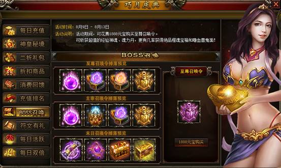 【活动说明】:活动期间,可花费1888元宝购买至尊召唤令。可斩获超值的经验神魂、魂力丹,更有几率获得绝品橙魂宝箱和嗜血兽鬼面!