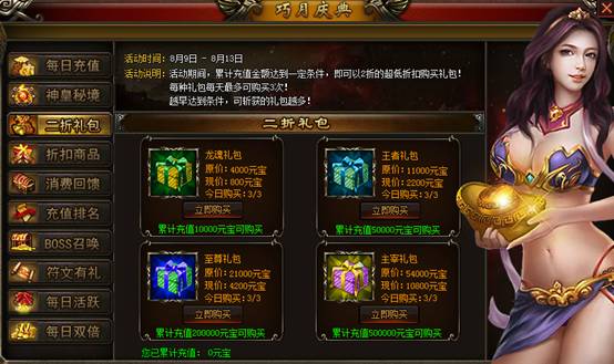 【活动说明】:活动期间,累积充值金额达到一定条件,既可以2折的超低折扣购买礼包!每种礼包每天最多可购买3次!越早达到条件,可斩获的礼包越多