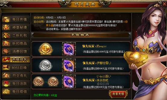 【活动说明】:活动期间,本服累计充值排名前5名便可获得丰厚奖励!排名第1更可获得11级黑水晶的奖励!累积充值300000元宝即可参与排名!活动结束后,奖励通过邮件发放!