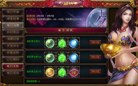 【活动时间】:当活跃度达到50、100、150后,可获得相对应的奖励!