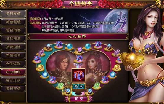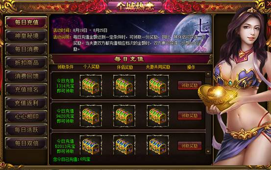 【活动说明】:每日充值金额达到一定条件时,可领取一份奖励,同时,其伴侣可获得一份奖励。当夫妻双方都充值相应档次的金额时,双方更可获得一份额外的奖励。