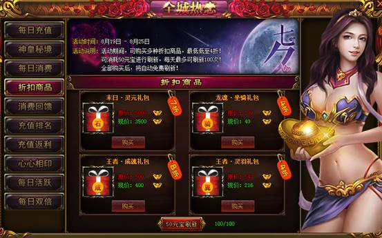 【活动说明】:活动期间,可购买多种折扣商品,全场最低低至4折!可消耗50元宝进行刷新,每天最多可刷新100次!全部购买后,将自动刷新!