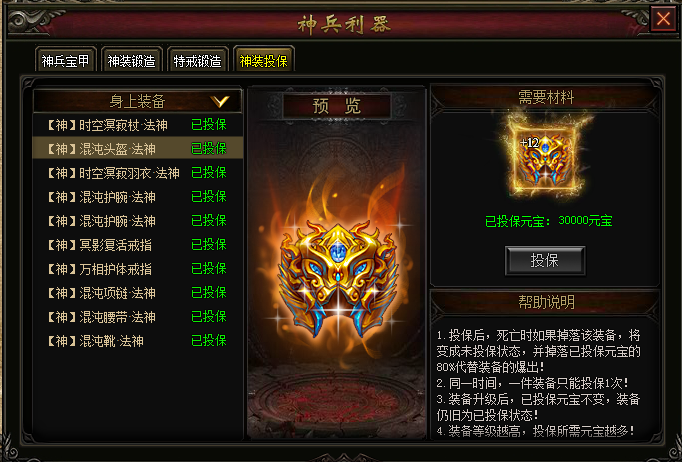 在【神兵利器】界面可以为身上的神装进行投保,成功投保后,若因死亡导致已投保装备掉落,那么掉落将会变为元宝,身上装备不会掉落!