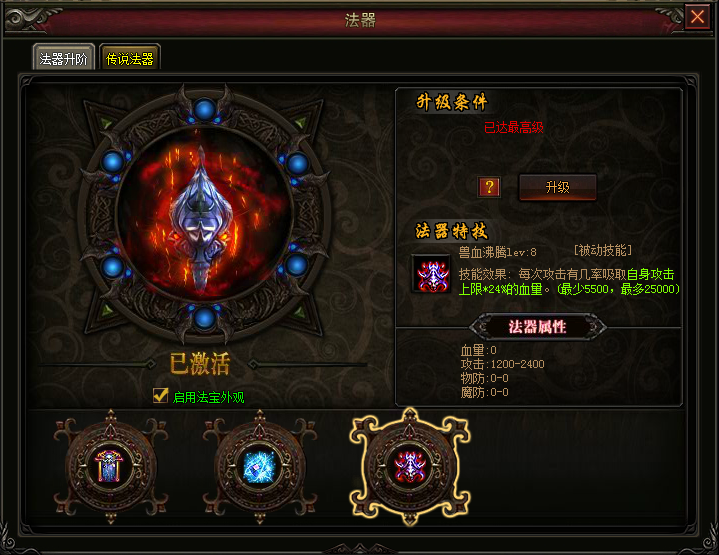 在传说法器界面,只要达到对应的升级条件,即可提升法器等级,提升法器属性,提高法器技能效果。