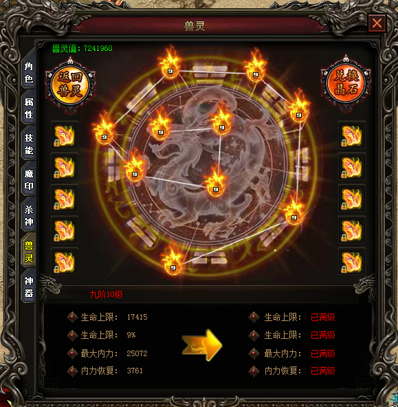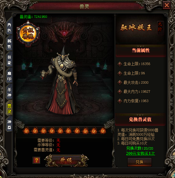 每天可以通过兽灵界面,使用人物经验兑换兽灵值。使用兽灵值可以对兽魂进行升级,同时也可以兑换和升级晶石。