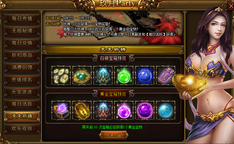 活动说明:祈祷一次可获得一个宝物奖励!每整10次祈祷,则可百分百获得一个黄金级宝物!每次祈祷需要消耗1个祈祷令,可通过参与日常副本和每日活跃获得!