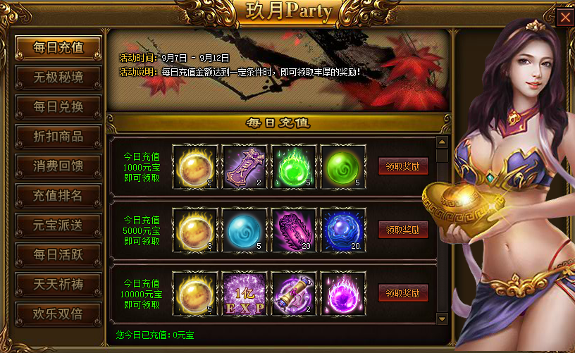 活动说明:每日充值达到一定金额时,即可领取丰厚的奖励。