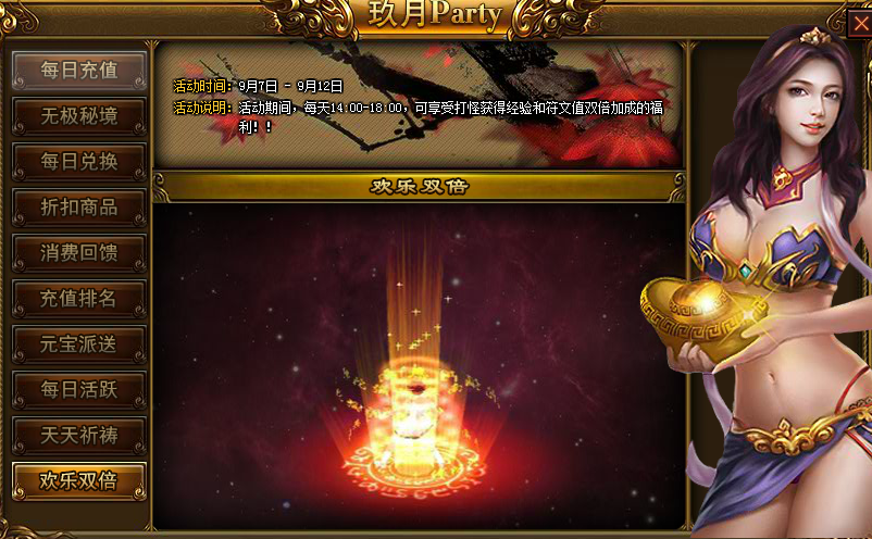 活动说明:活动期间,每天14:00 – 18:00,可享受打怪获得经验和符文值双倍加成的福利!