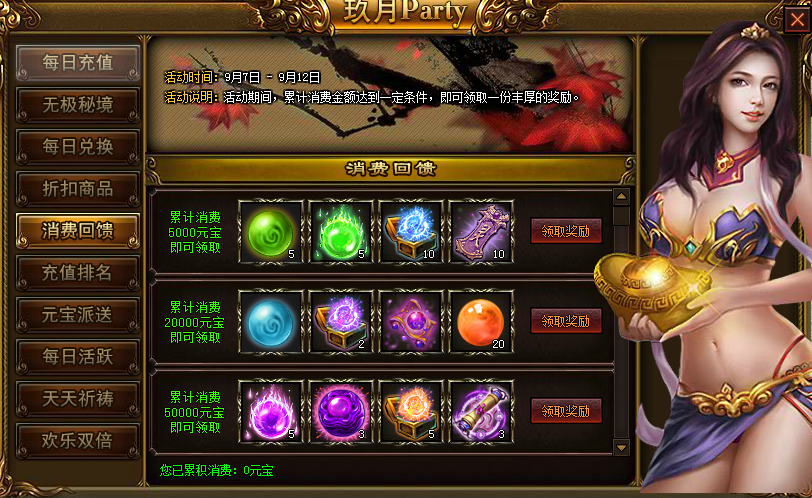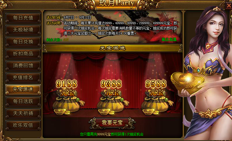 活动说明:活动期间,每天累计充值达到9999、49999、99999、499999,即可获得一次抽奖机会。每次抽奖需要消耗数量不等的元宝,抽奖成功即可获得三大元宝奖励之一。抽奖次数每天24:00点重置。