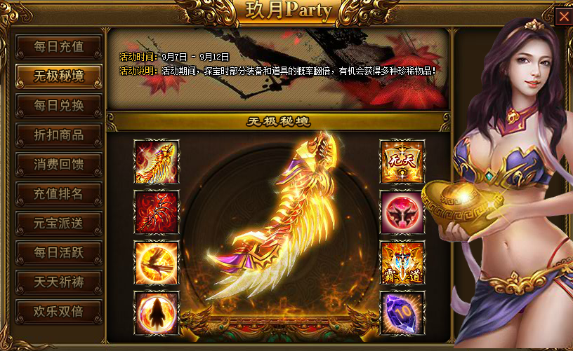 活动说明:活动期间,探宝时部分装备和道具的概率翻倍,有机会获得多种珍稀物品