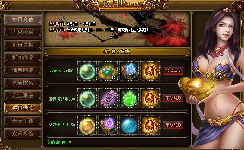 活动说明: 当活跃度达到50、100、150后,可获得对应的奖励!