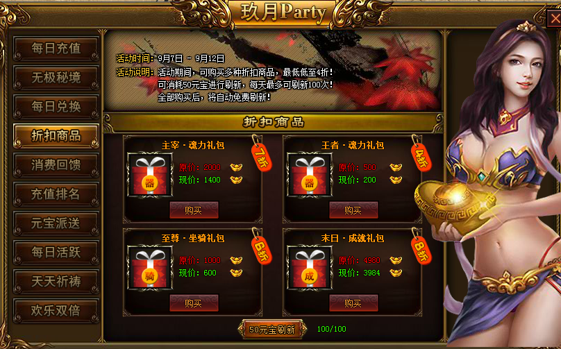 活动说明:活动期间,可购买多种折扣商品,最低低至4折!可消耗50元宝进行刷新,每天最多可刷新100次!全部购买后,将自动免费刷新!