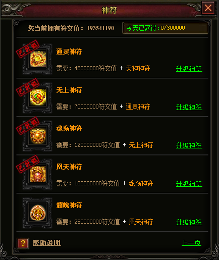 通过击杀等级≥自身等级的怪物,即可获得符文值,系统双倍时间内,符文值还会翻倍,同时还可以通过绑定商城购买符文卷轴,使用后也可获得符文值;前往土城NPC神术师处使用相应的符文值可兑换和升级神符。