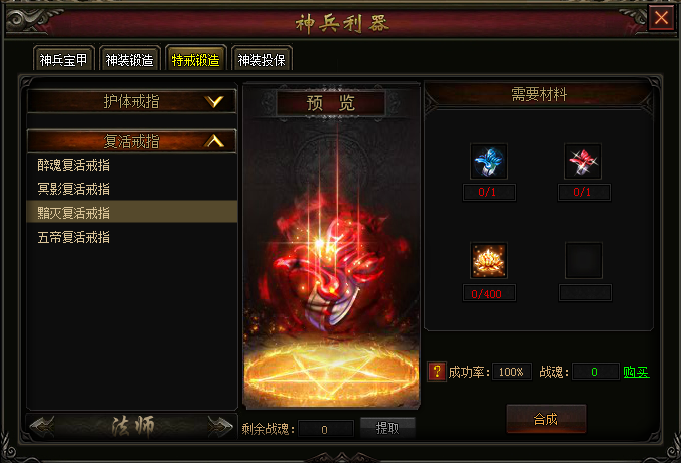 新增四阶黯灭复活戒指、五阶五帝复活戒指,使用复活戒指和永恒晶钻即可将对应等阶的复活戒指进行升级;复活戒指等阶越高,CD时间越短,戒指本身属性越高,是您畅快PK的首选!