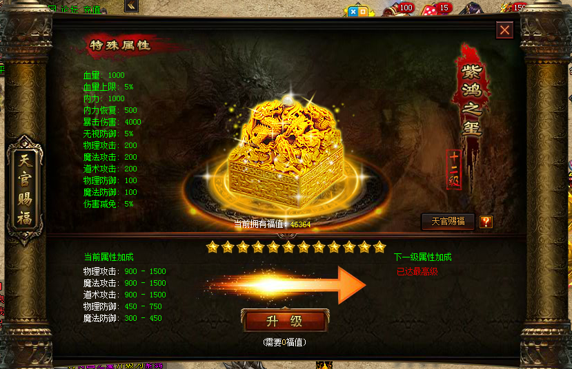 新增十二级福印——紫鸿之玺,属性更强大,特殊属性更是暴击伤害,助您PK输出更高,PK更爽,实乃提升战力的不二选择!