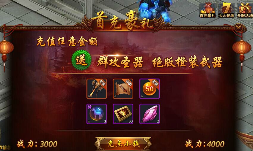 1. 玩家角色达到20级(只需5分钟即可轻松达到),即可免费领取史上超豪华首充礼包;