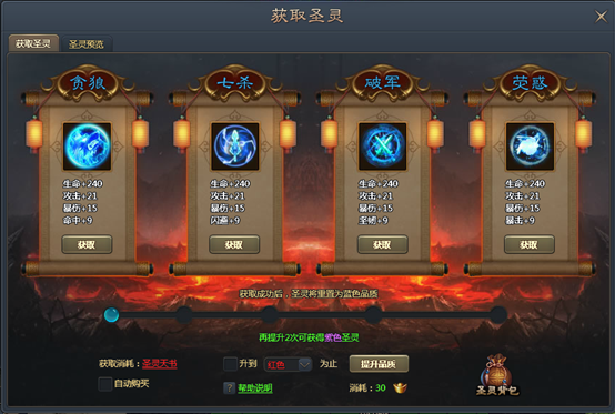 [3] 每个圣灵分为5级,等级越高、获得属性战力加成越高,圣灵可通过吞噬其他圣灵来提升等级,但不可吞噬高于自身品质的圣灵