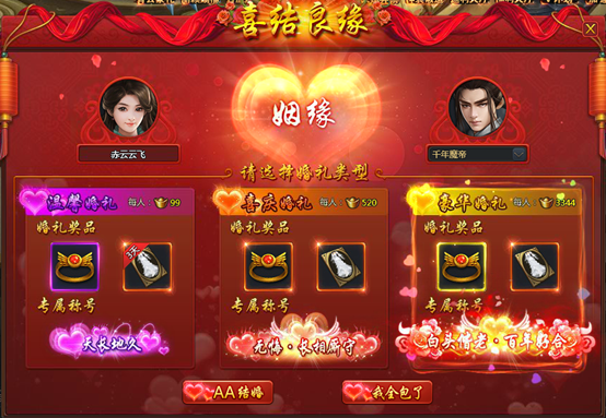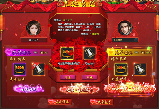 [2] 选择越豪华的婚礼,婚礼奖励与永久称号增加的属性与战力会越高。